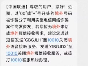 本帖最后由 guiying 于 2025-5-25 19:12 编辑 如果有境外骚扰电话及诈骗短信可以参考 通过短信发送GBGJLH至10010关闭境外语音接听服务, 发送短信GBGJDX至10010关闭境外短信接收服务, 或拨打10010客服热线办 ... 查看全文