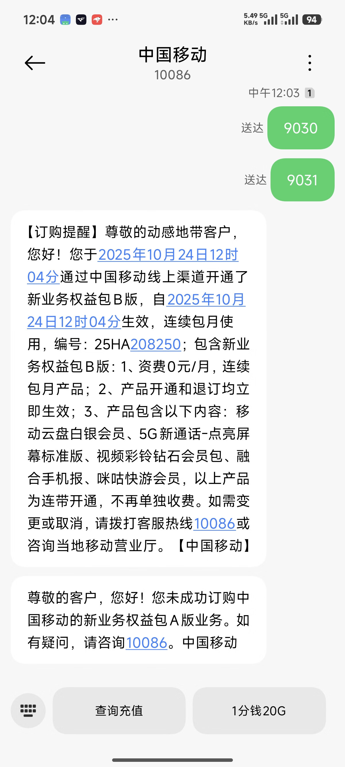 发短信9031到10086→开通新业务权益包B版