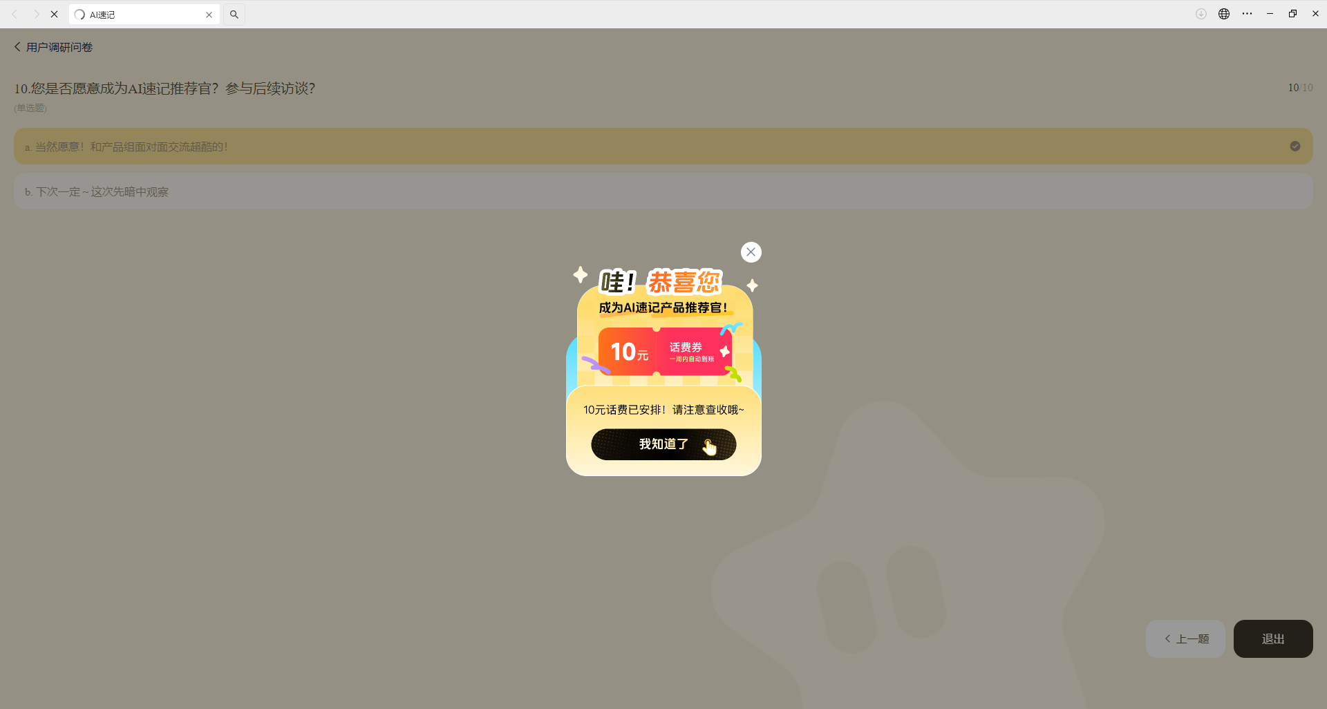 注意,**调查问卷最后面第10题一定要选第一个 当然愿意,成为AI速记产品推荐官**