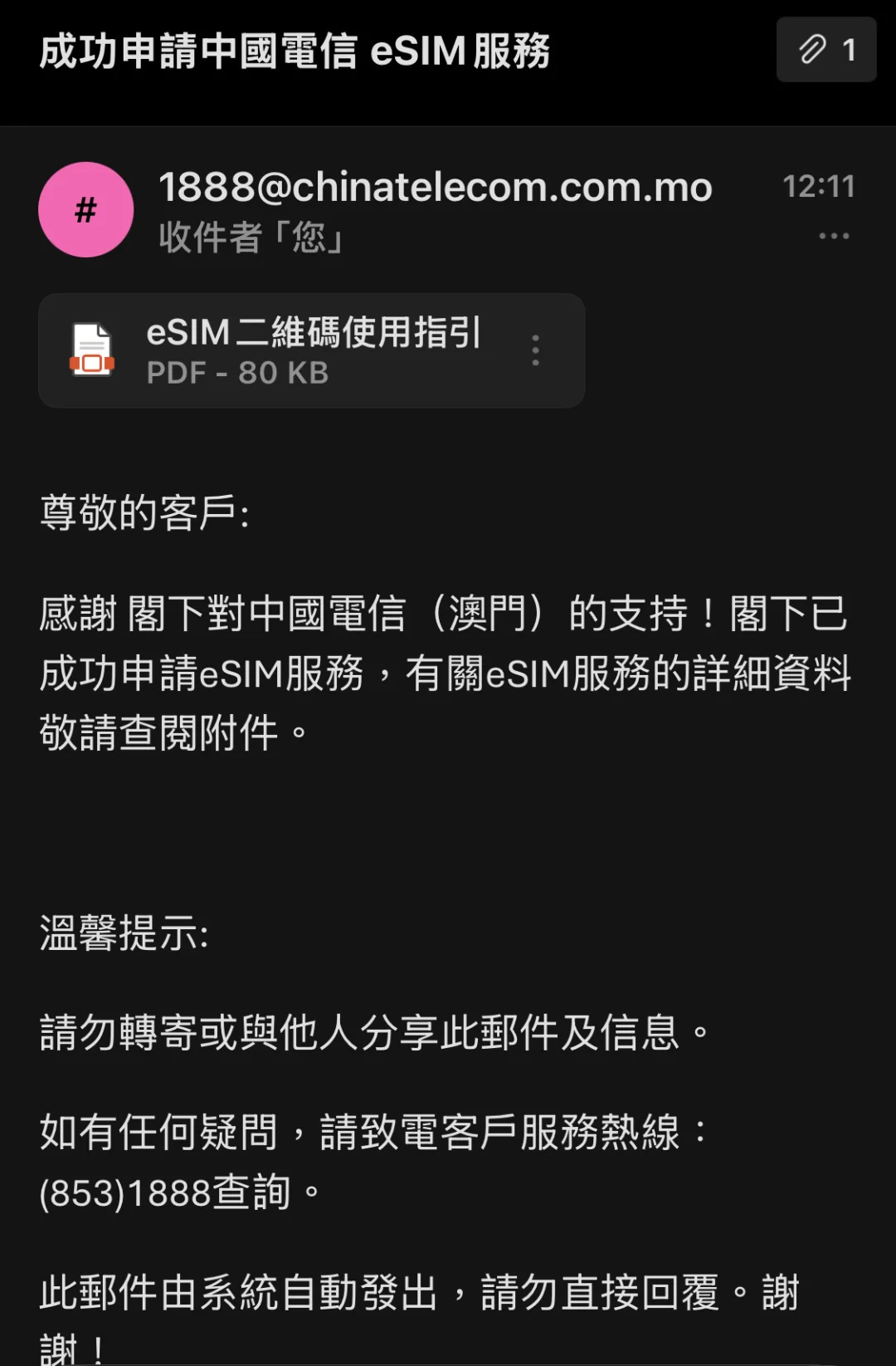 然后我直接问说澳门中国电信的eSim有机型限制的?他还敢回我说有啊,我刚刚申请的时候有跟你讲,只是你坚持要,然后就收了验证码就申请成功了???