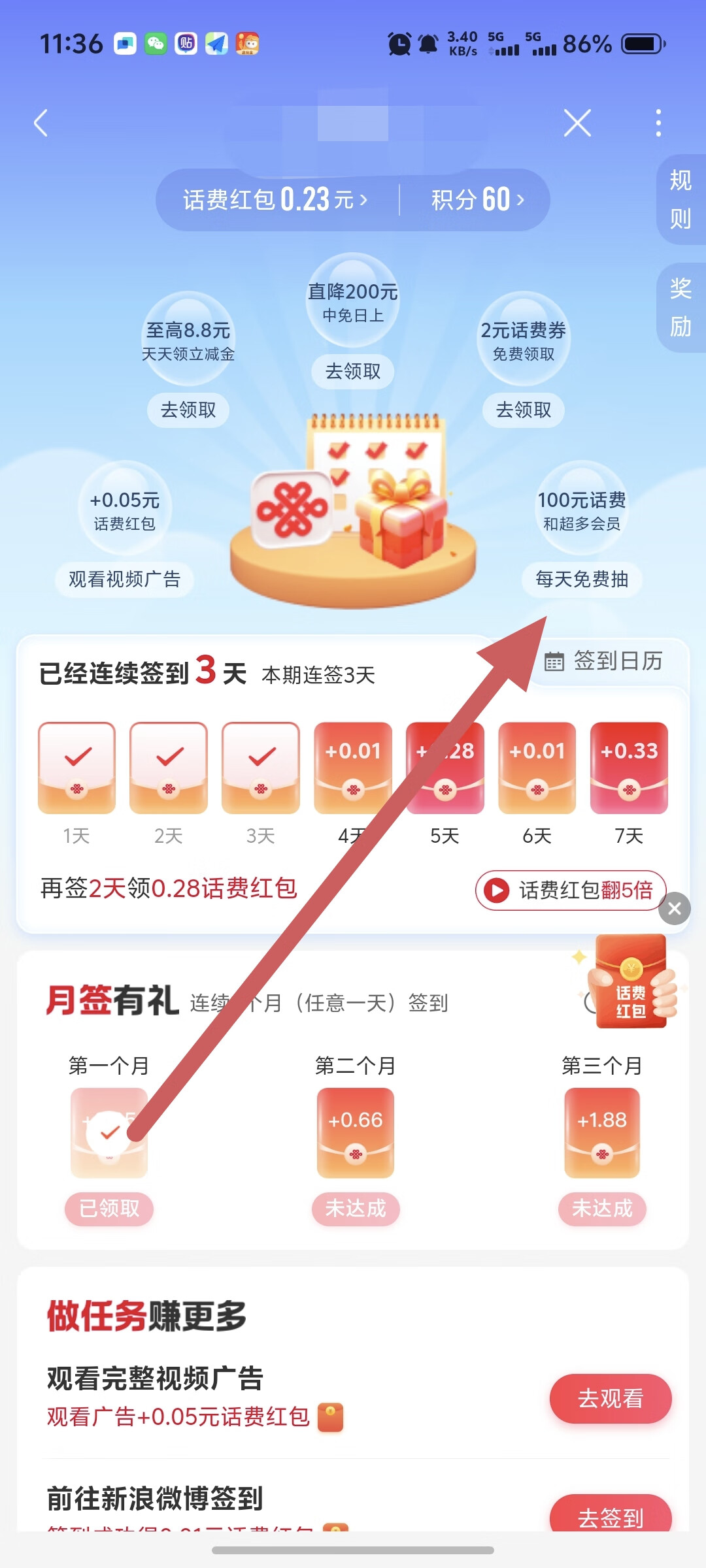 联通客户端,点击我的——进去找到话费优惠,往下去签到页面