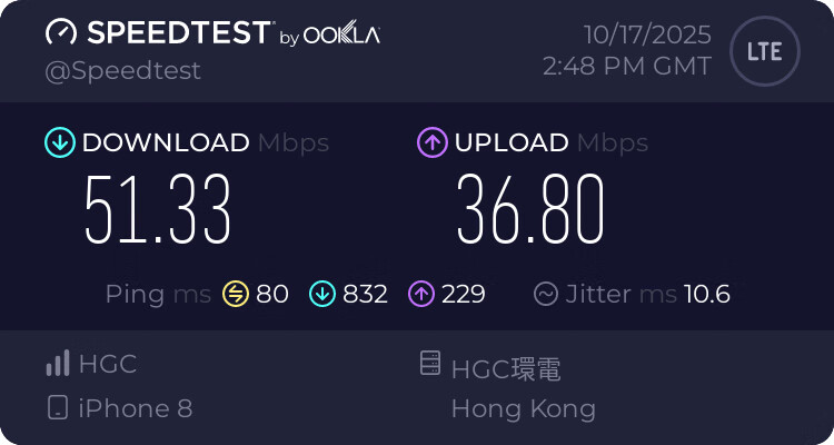 speedtest 显示 IP 地址是 HGC,到 HGC 节点有 51Mbps 下载速度,上传 36Mbps。