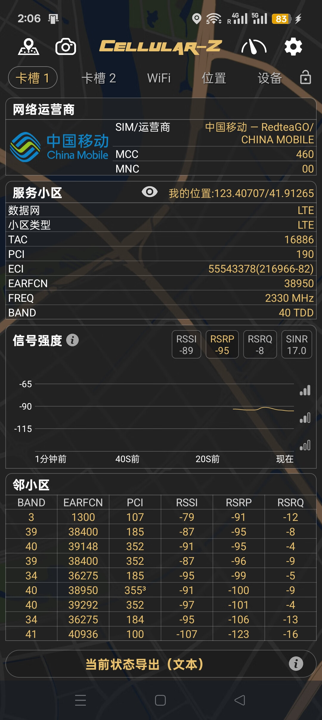 接下来尝试连接到不同的运营商和测试信号,在沈阳似乎只能漫游接入中国移动,但没有5G(5G开关打开但不能连入),所处位置在基站旁。