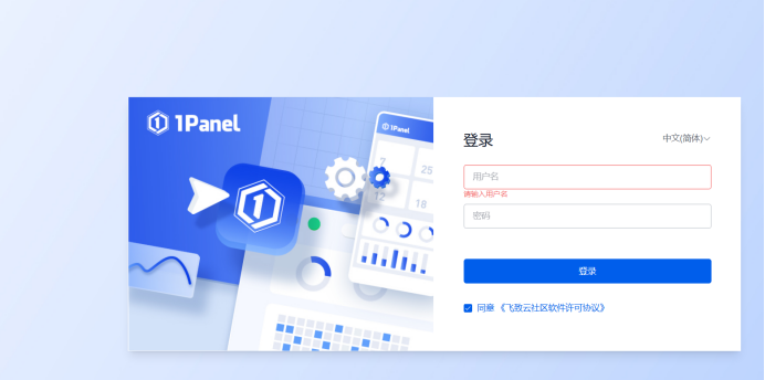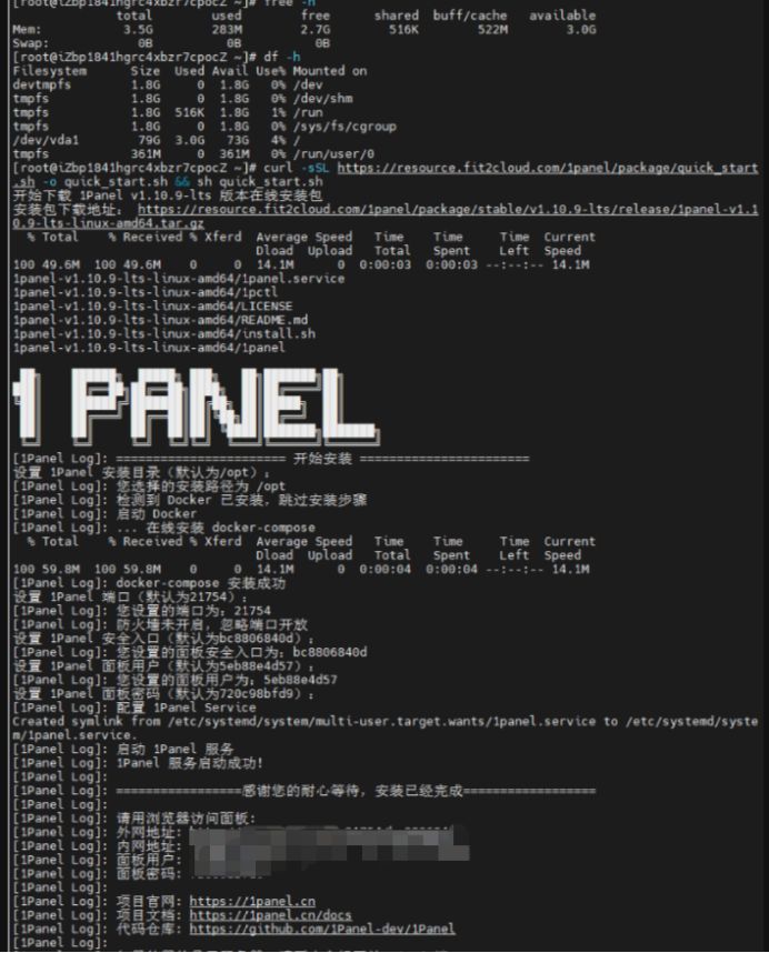 安装成功后,控制台会打印面板访问信息,可通过浏览器访问 1Panel: