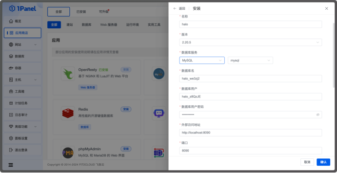 数据库名:Halo 使用的数据库名称。1Panel 会在所选数据库中自动创建该数据库。